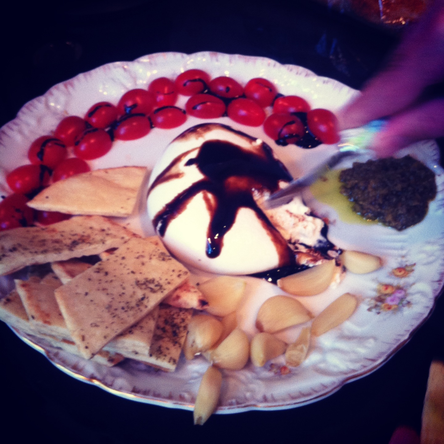 Burrata di buffalo with roasted garlic, Italian naan, balsamic glaze, grape tomatoes and home made pesto.